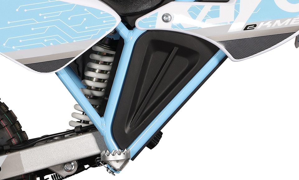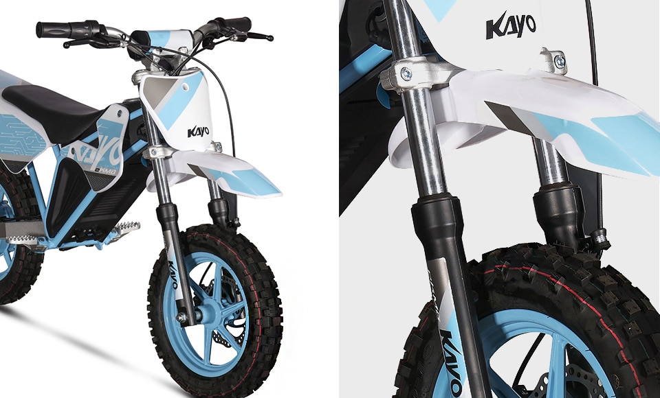 Der Rahmen ist von Kayo und auf Offroad ausgelegt. Mit 10-Zoll-Aluminium-Rädern entsteht ein kompakter, stabiler Mini-Crosser. Es ist kein Spielplatz-Roller, sondern ein echtes Kindermotorrad für den Einstieg in Motocross- oder Enduro-ähnliche Einsätze.