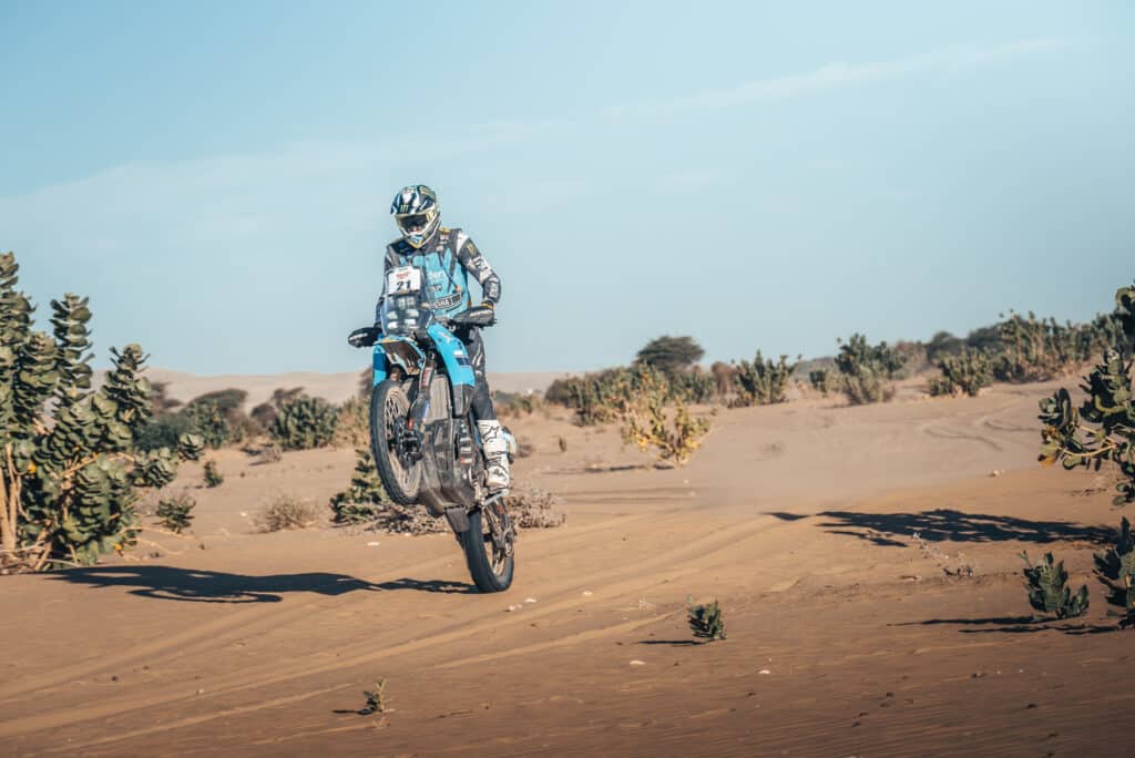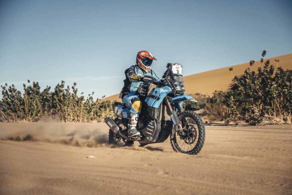 Paulin, ehemaliger MXGP-Fahrer und fünffacher MXoN-Sieger, nimmt nach seinem Sieg in der Autoklasse bei der AER 2024 erstmals in der Motorradkategorie teil. Der 35-Jährige ließ sich seine mangelnde Erfahrung mit Roadbooks nicht anmerken, indem er lange Strecken der Etappe allein zurücklegte und mit seiner Ténéré 700 Rally förmlich durch die Wüste raste.