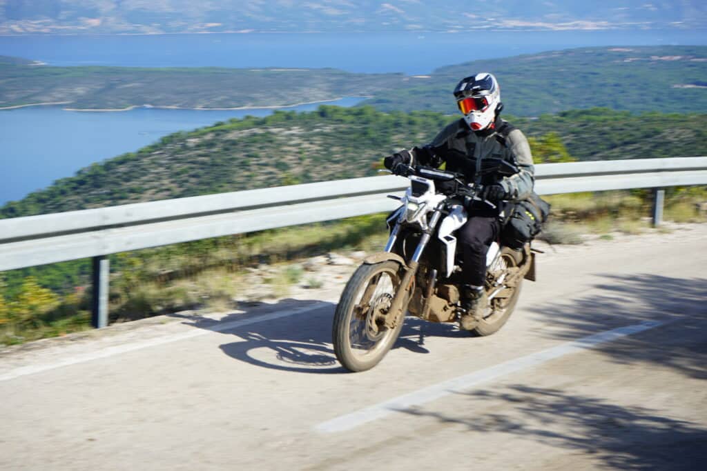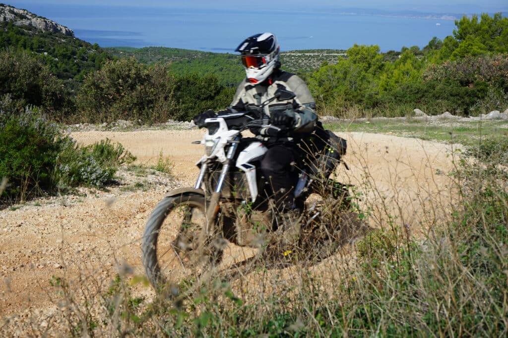 Die Alp bietet eine Bodenfreiheit von 270mm. Das ist, bedingt durch den großen Auspuffsammler an dieser Stelle viel weniger als eine Sportenduro, aber mindestens soviel Freigängigkeit und eher mehr als bei den meistern Großenduros. Auf unseren Touren in Kroatien und Italien hatten wir zahlreiche Bergauf und Bergabpassagen auf gewachsenem Boden und häufig auch leicht stufenförmig. Ich hatte jedoch niemals harten Bodenkontakt. Vielmehr gab es gerade in Kroatien zahlreiche Pfützendurchfahrten, die deutlich tiefer als unsere Fußrasten waren und das Spritzwasser bis zu unseren Helmen beförderten.