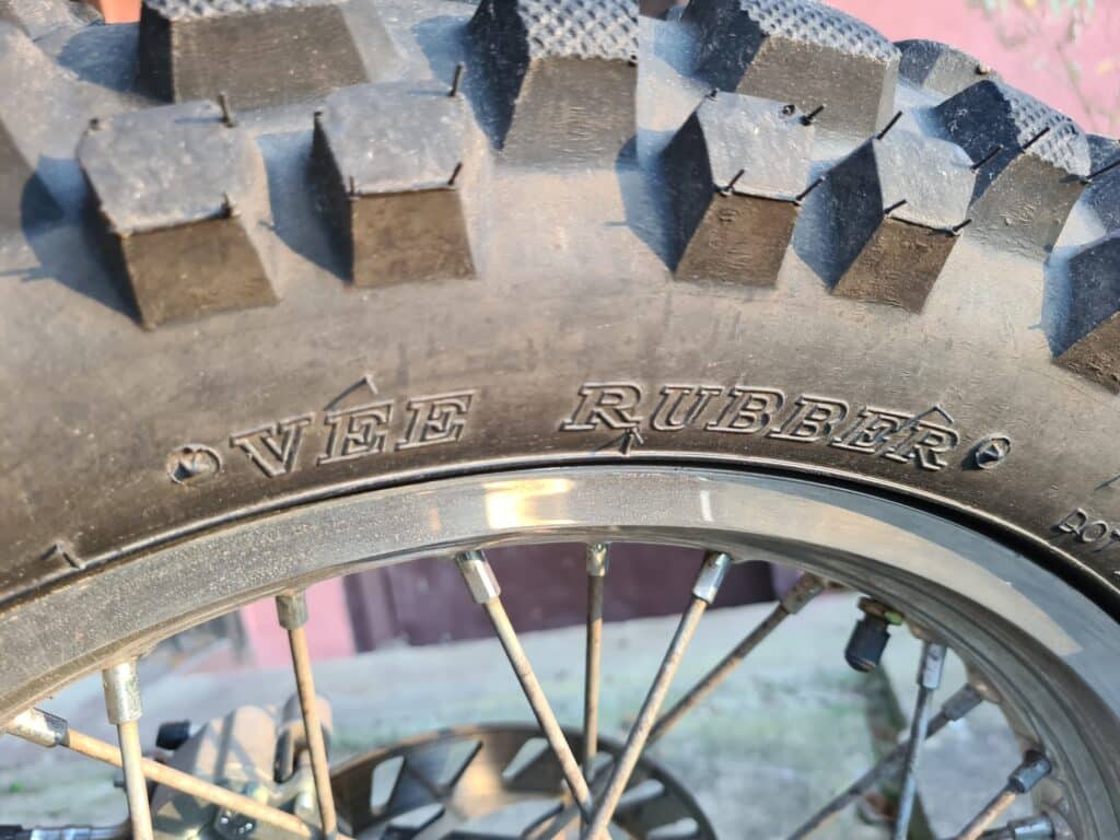 Die Beta Alp der neuen Generation rollt serienmäßig auf einer Bereifung der Dimension 90/90-21 (von) und 140/80-18 (hinten). Das sind die üblichen Standartwerte für die meisten Dual-Purpose-Bikemodelle, die sowohl auf der Straße als auch im Gelände gefahren werden. Serienausstatter ist die Firma VEE, die mir bis dato vollkommen unbekannt war. Eher zurückhaltend angegangen haben mich die Reifen positiv überrascht da sie auch in flott gefahrenen Landstraßen Kurven ein gutes Feedback geben und im Gelände sowohl im Matsch als auch im steinigen Terrain sowohl Vortrieb als auch Haltbarkeit und Widerstandsfähigkeit zeigen. Erst jetzt zum Ende ihres Reifenlebens und erst Recht auf regennasser Fahrbahn zeigen sie deutlich nachlassendes Grippverhalten.
