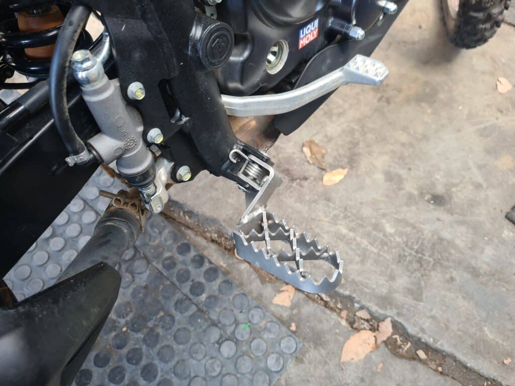 Ben und ich fahren unsere Beta`s eigentlich im Serienzustand. Unserer Körpergröße von jeweils über 190cm entsprechend haben wir allerdings eine 30mm Lenkererhöhung und eine Tieferlegung und Verlagerung der Fußrasten nach hinten mittels der SWT Ralleyfußrasten vorgenommen, die zudem eine größere Fußauflage bieten. Dies macht sich ungemein positiv bei langen Abschnitten im Stand durch eine wesentlich entgespanntere Körperhaltung bemerkbar.