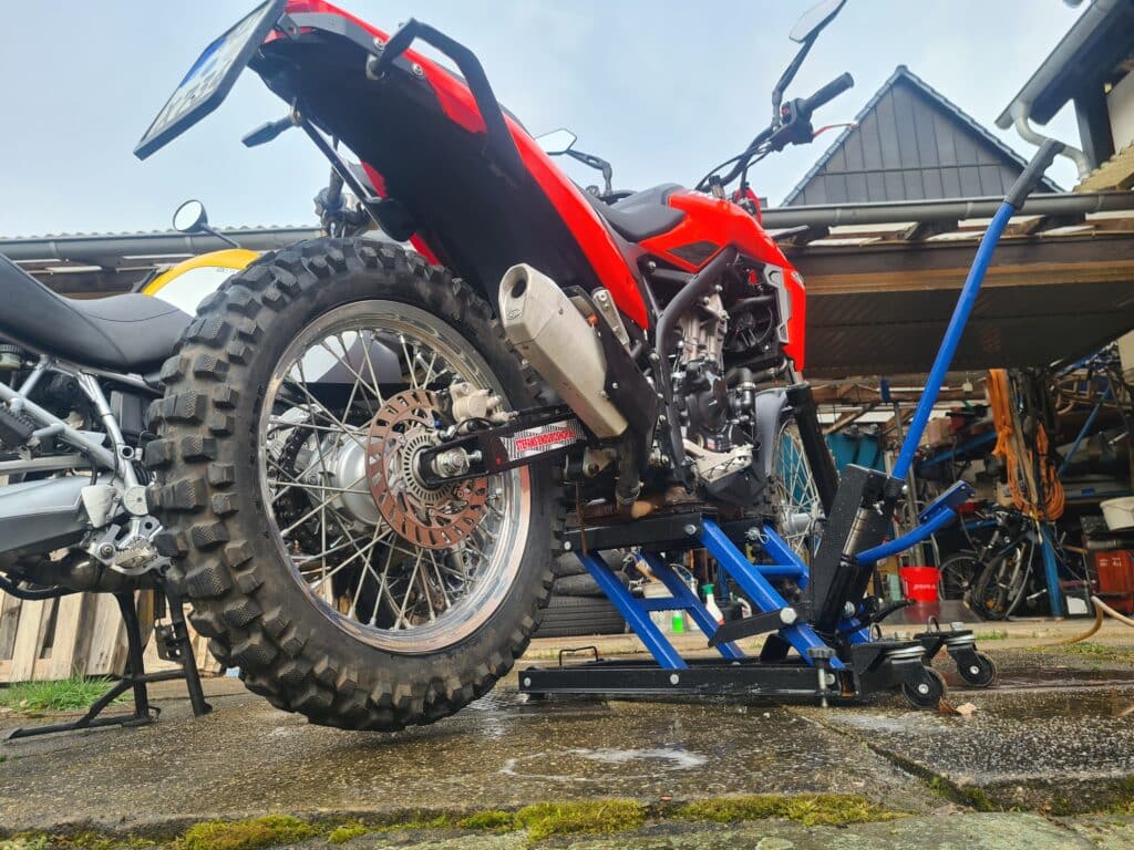 Die 140kg der neuen Beta Alp und die Federwege v/h von 185mm/195mm gepaart mit der üblichen Offroad Bereifung von 21 Zoll am Vorderrad und 18 Zoll auf dem Hinterrad sollten die besten Voraussetzungen für unsere Anforderungen sein.