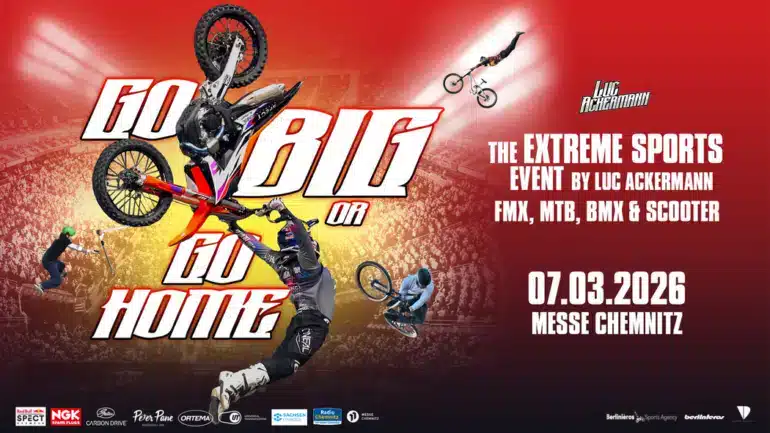 Der Thüringer Freestyle Motocross Sportler Luc Ackermann, FIM Weltmeister, FIM Europameister, XGames Goldmedaillengewinner, NIGHT of the JUMPs World Tour Champion 2025 und 11-facher Weltrekordler kommt am 07. März 2026 mit seiner Extremsportshow GO BIG OR GO HOME in die Messe Chemnitz. FMX-, BMX-, MTB- und Scooter-Sportler aus der ganzen Welt kommen nach Chemnitz, um über 2,5 Stunden die krassesten Tricks auf zwei Rädern zu zeigen. Eine Freestyle und Actionsport Show, wie es sie in Chemnitz noch nie gegeben hat. Jetzt präsentiert Luc Ackermann die ersten Freestyle Superstars für sein Event.