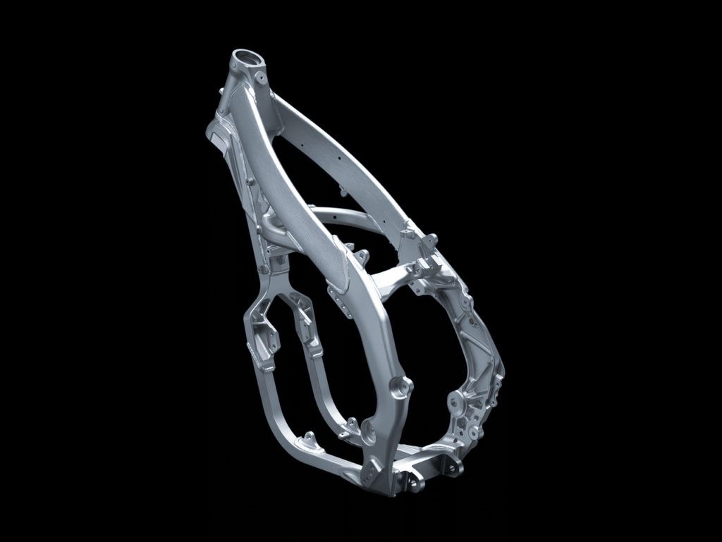 Herzstück der neuen KX250 ist der leichte Aluminium-Perimeter-Rahmen, der sich an der 2024er KX450 orientiert. Die Überarbeitung zielt auf eine optimierte Steifigkeitsbalance ab, um das Gefühl fürs Vorderrad zu schärfen und das Handling in Wechselkurven zu erleichtern. Die Geometrie ist auf Motocross-Einsatz zugeschnitten: stabil bei Highspeed, aber agil in engen Kurven. Die Sitzhöhe von 955 mm und das fahrfertige Gewicht von 109,5 kg liegen im klassenüblichen Bereich, der schmale Aufbau lässt das Bike kompakt wirken.