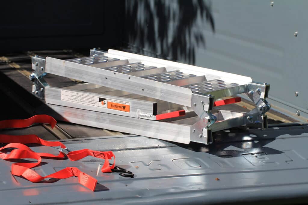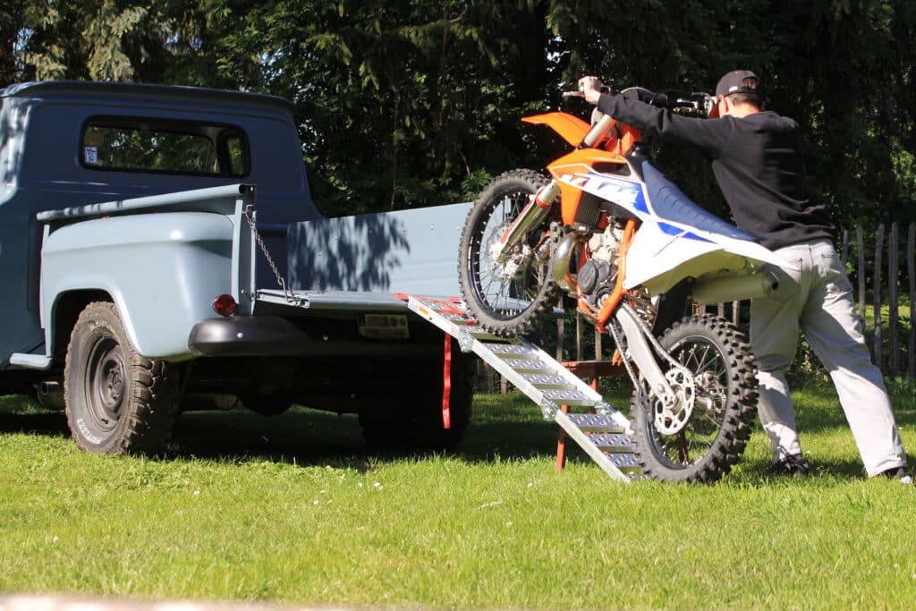Stabile, faltbare Alurampe für den Motorradtransport, ideal für Enduro, Motocross und Straßenmotorräder (Foto: racefoxx.com)