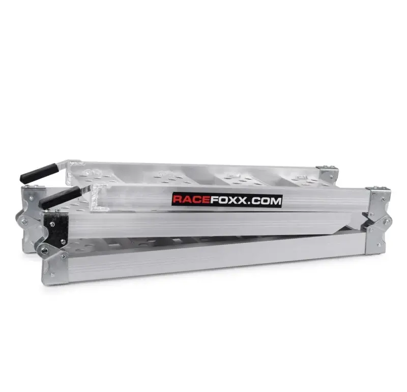 Zusammengefaltete Aluminium Auffahrrampe mit Tragegriffen und RACEFOXX.COM Logo, geeignet zum Verladen von Motorrädern