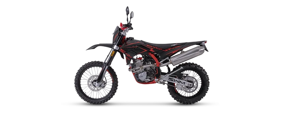 Die Basis der SWM RS 300 R ist ein stabiler, stählerner Gitterrohrrahmen. Mit einem fahrfertigen Gewicht von 132 kg bleibt die Maschine agil und lässt sich präzise über enge Singletrails lenken. Die Sitzhöhe von 963 mm zeigt, dass es sich um ein Sportgerät für geübte Fahrer handelt.