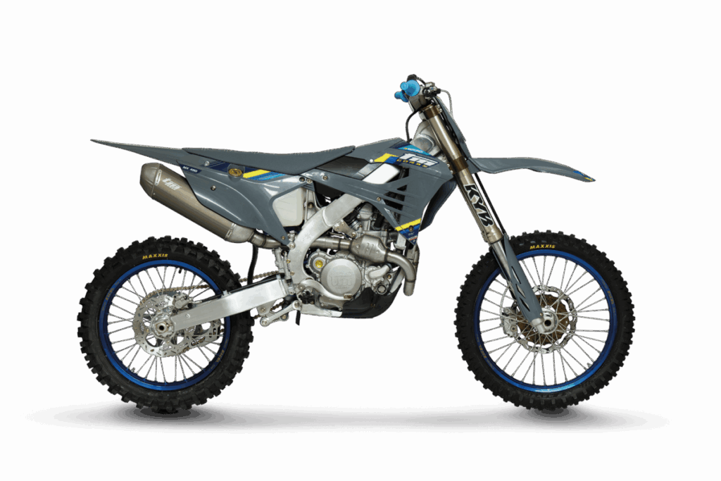 Der flüssigkeitsgekühlte Viertakt-Single hat 449 cm³ Hubraum, mit einer Bohrung von 95 mm und einem Hub von 63,4 mm. Diese Geometrie sorgt für spontanes Ansprechen und breit nutzbare Leistung. Die Kraftübertragung erfolgt über ein 5-Gang-Getriebe, typisch für MX-Motoren, bei denen klare Abstufungen priorisiert werden. Die Mehrscheibenölbadkupplung bietet Vorteile in Hitzebeständigkeit und Dosierbarkeit. Elektronisch wird eine hauseigene TM Moto-Steuerung mit eMoticom-Gerät verwendet, das präzises Mapping für das Einspritzsystem ermöglicht und kontrollierbaren Vortrieb bei wechselnden Gripverhältnissen gewährleistet.